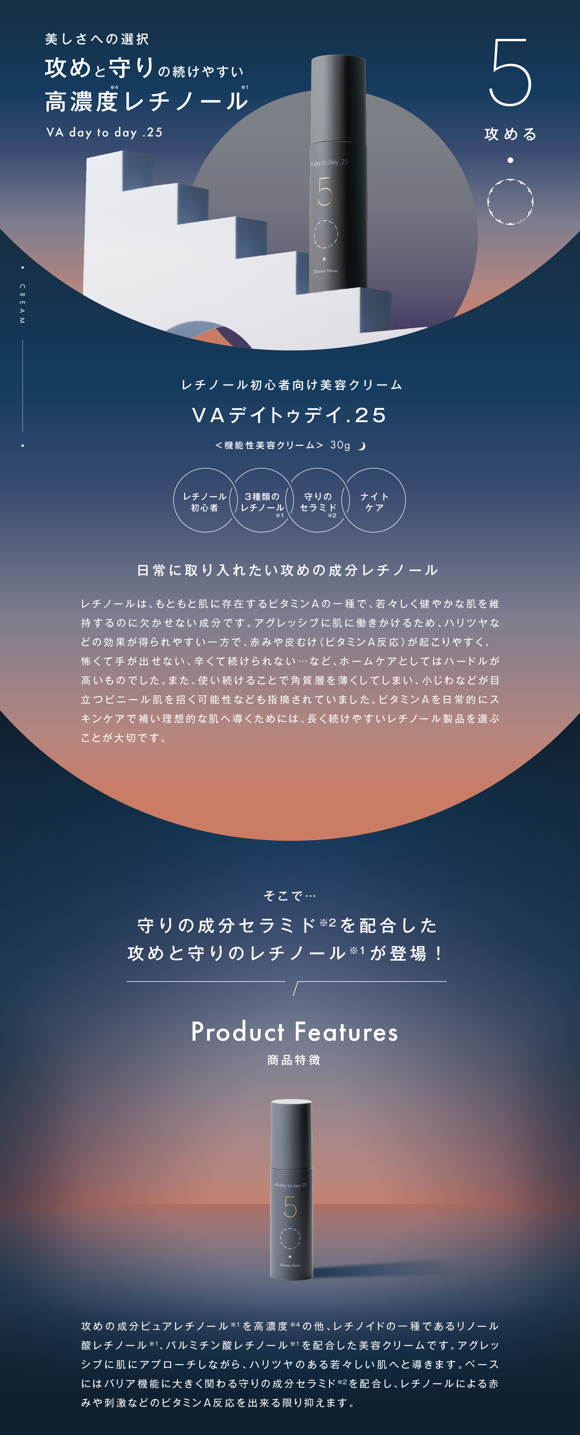| 特徴 | 3 種のビタミンA ※1~3でハリのあるなめらかな肌へ整えます。また、ビタミンA によるアクティブな反応を抑えるために肌バリアを整えるセラミド成分※4を高濃度※5配合しています。そのほかにも保湿成分や肌荒れを抑える成分を配合し、つややかな肌へ導きます。 ※1:レチノール(整肌成分)※2:パルミチン酸レチノール(整肌成分)※3:リノール酸レチノール(整肌成分)※4:セラミドAP、セラミドEOP、セラミドNP、ジラウロイルグルタミン酸リシンNa、フィトスフィンゴシン(整肌成分)※5:当社比 |