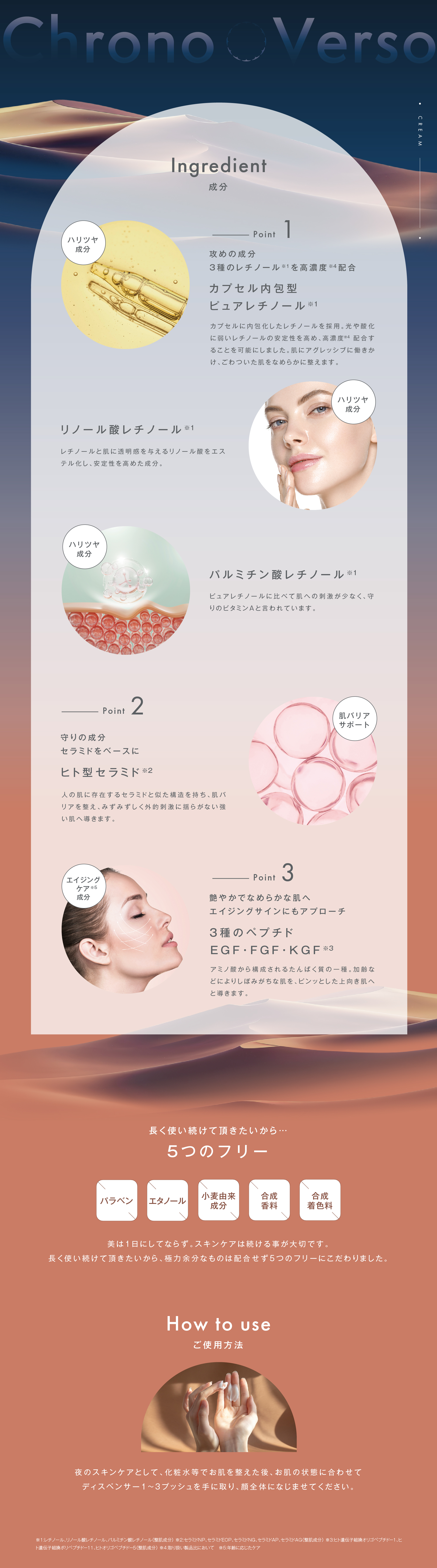 | ご使用方法 | 夜のスキンケアとして、化粧水等でお肌を整えた後、お肌の状態に合わせてディスペンサー1 ~ 3プッシュを手に取り、顔全体になじませてください。 |