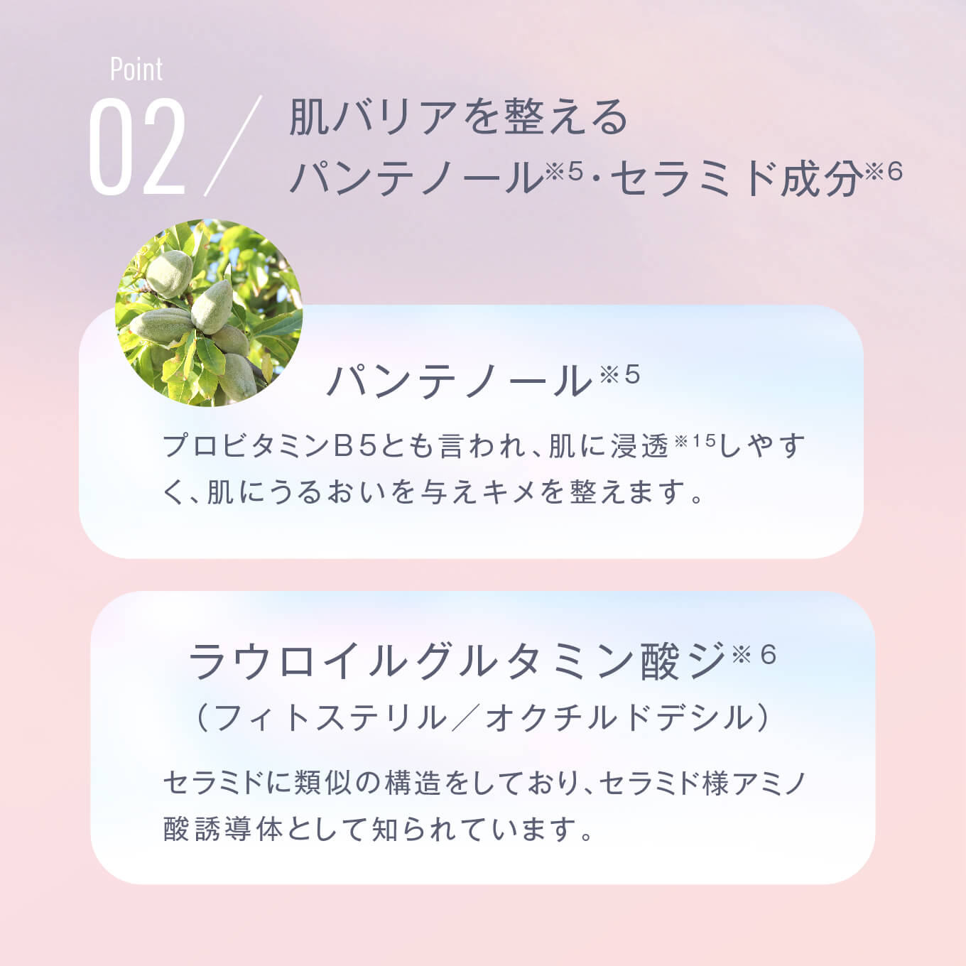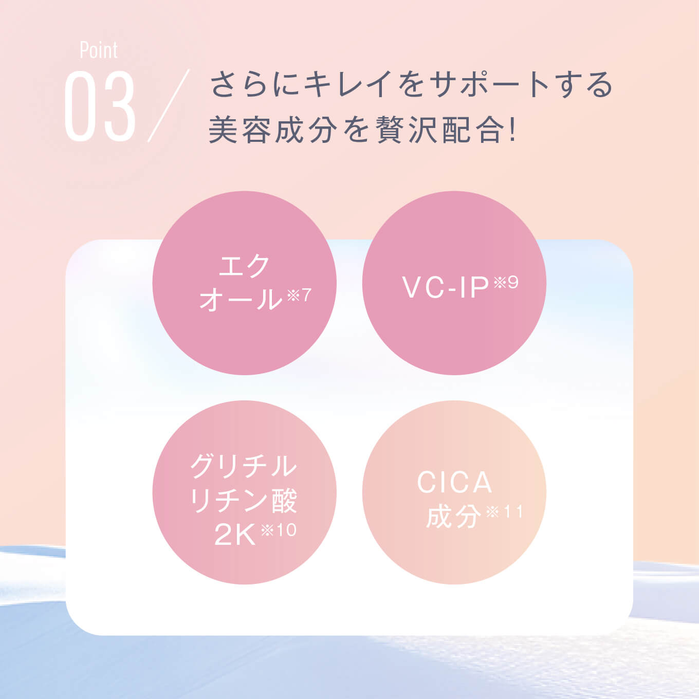 | 成分 | 水、BG、プロパンジオール、DPG、トリエチルヘキサノイン、スクワラン、トリ(カプリル酸/カプリン酸)グリセリル、ステアリン酸ソルビタン、ジメチコン、テトラヘキシルデカン酸アスコルビル、アゼロイルジグリシンK、パンテノール、グリシルグリシン、グリチルリチン酸2K、(アスコルビル/トコフェリル)リン酸K、トコフェロール、トロメタミン、ナイアシンアミド、アラントイン、ラウロイルグルタミン酸ジ(フィトステリル/オクチルドデシル)、マデカッソシド、アシアチン酸、マデカシン酸、アシアチコシド、セバシン酸、10-ヒドロキシデカン酸、1,10-デカンジオール、エクオール、ポリアクリレート-13、ステアリン酸グリセリル(SE)、エチルヘキシルグリセリン、ポリアクリレートクロスポリマー-6、ポリイソブテン、イソステアリン酸ソルビタン、ヤシ脂肪酸スクロース、ラウリン酸K、(PEG-240/デシルテトラデセス-20/HDI)コポリマー、ポリソルベート20、PPG-6デシルテトラデセス-30、t-ブタノール、ペンチレングリコール、リナロール、フェノキシエタノール |