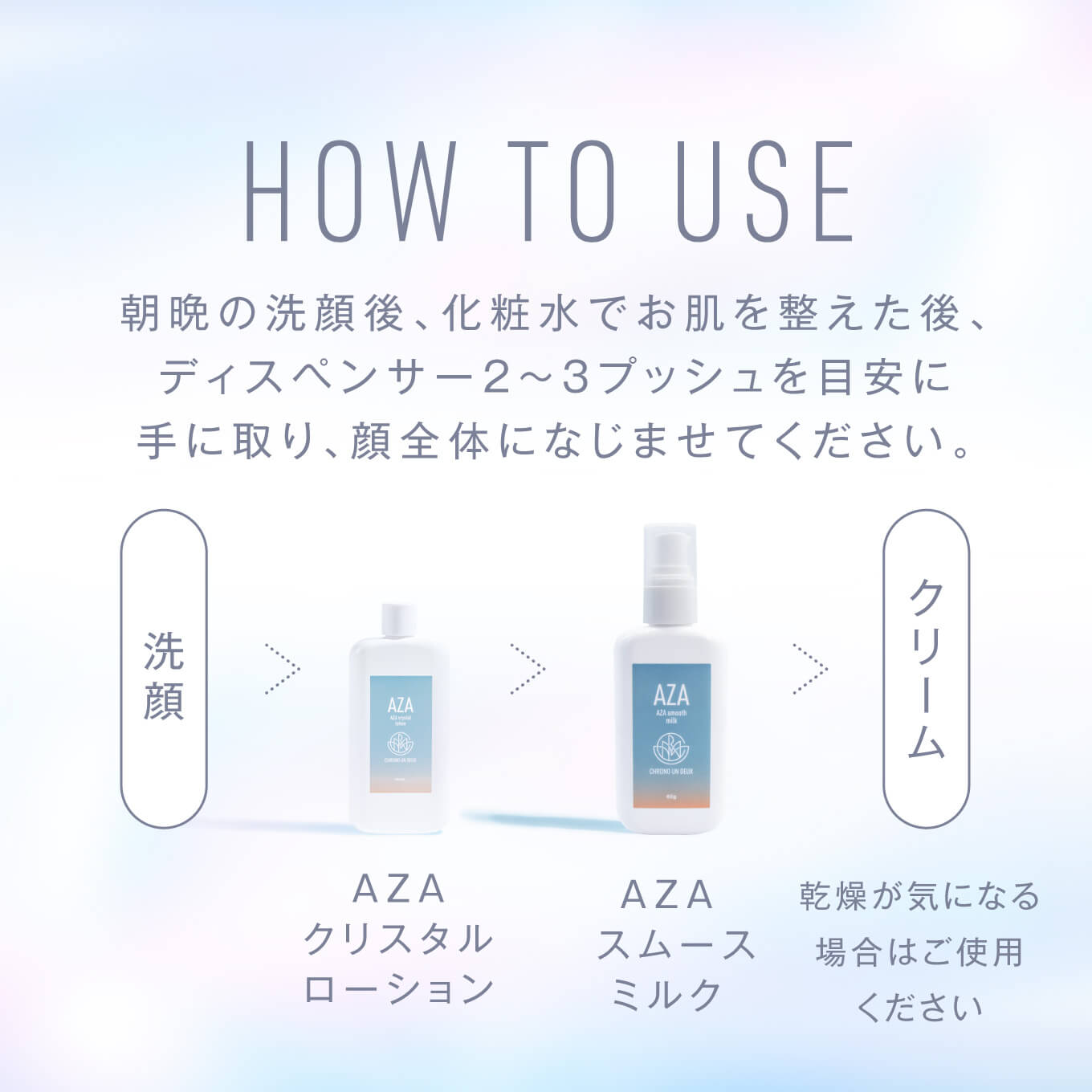 | ご使用方法 | 朝晩の洗顔後、化粧水でお肌を整えた後、ディスペンサー2~3プッシュを目安に手に取り、顔全体になじませてください。 |